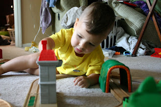 The Train Engineer Hard at Work. Nick got some new trains at a yard sale this weekend and has thoroughly enjoyed playing with them.